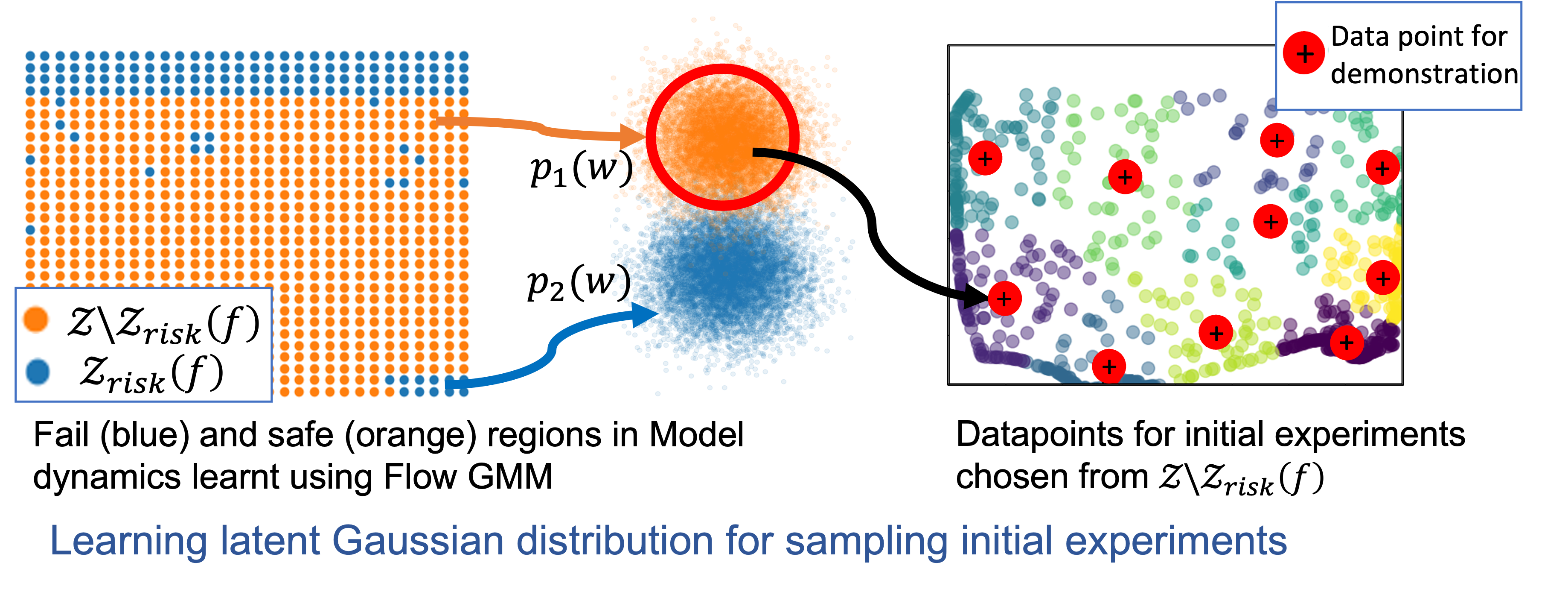 We first sample failures using MC sampling in simulation, and learn the boundary between fail and safe using a Normalizing Flows based classification. This is followed by a projection in the latent space to sample exclusively from predicted ‘safe’ regions in sim. This is our testbed for failures in real system.