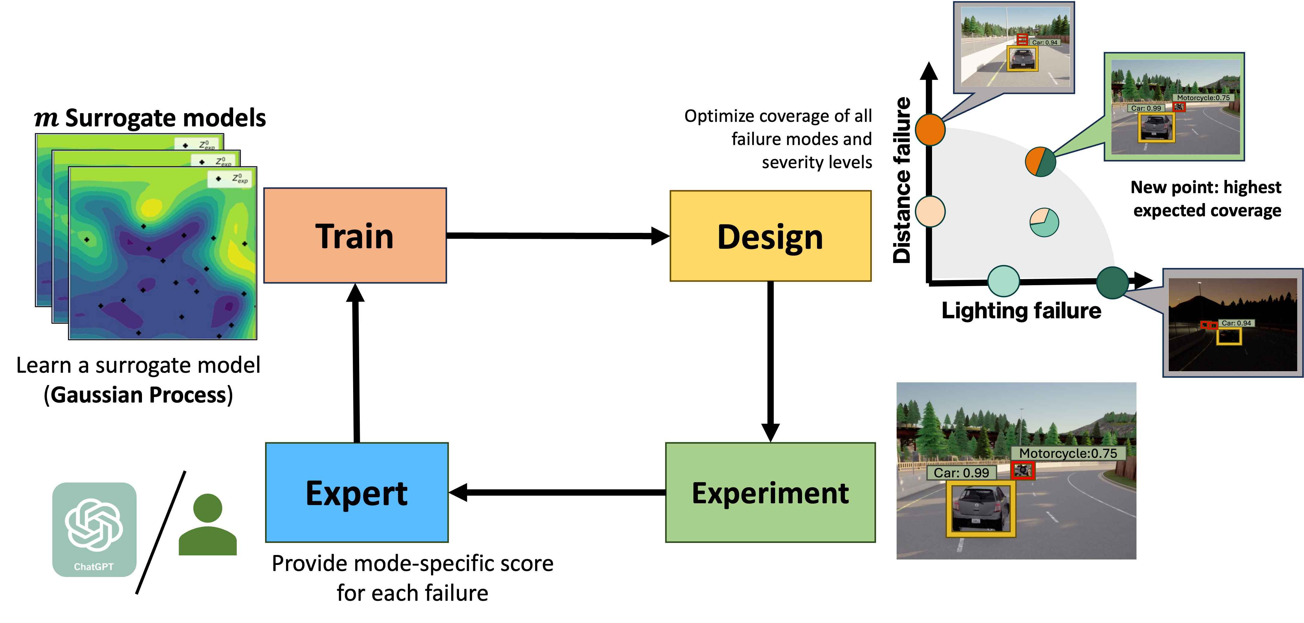 Novel failure discovery method that combines information from simulation and real-world systems using sampling based tchniques and Bayesian Experimental Design